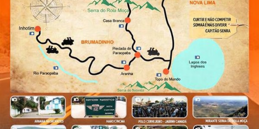 A Rota Capitão Senra é um roteiro clássico para motociclistas em Minas Gerais, com cerca de 140 km, começando em Macacos (São Sebastião das Águas Claras), passando por Casa Branca, Piedade do Paraopeba, Brumadinho (Inhotim), Serra da Moeda e Topo do Mundo, oferecendo curvas, paisagens e cultura, ideal para curtir com uma parada em Inhotim e apreciar o pôr do sol na Serra da Moeda, ligando as rodovias BR-040 e BR-381.